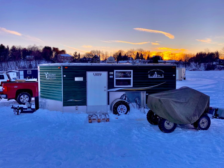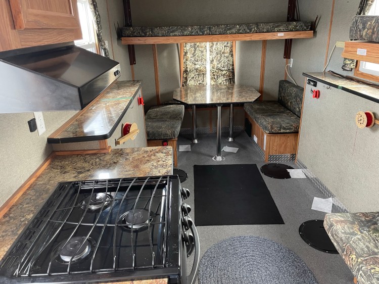 - 8X16 Ice Castle Trophy Hunter has 6 holes and can comfortably fish 6 people and has 4 individual bunks.
