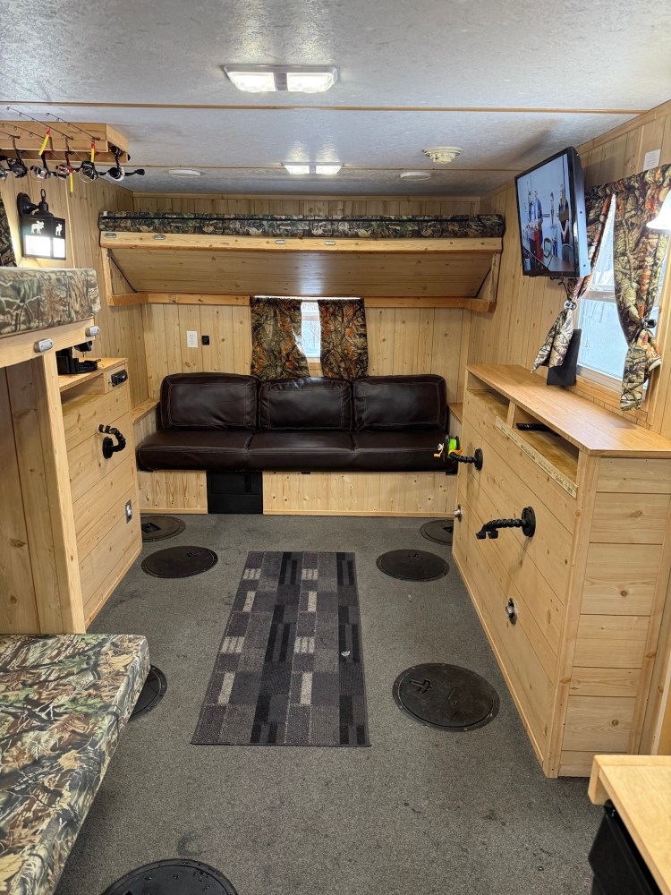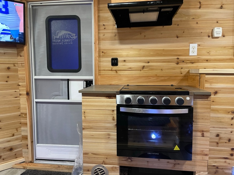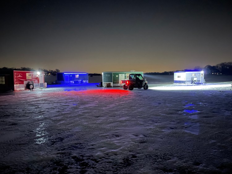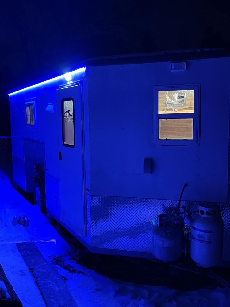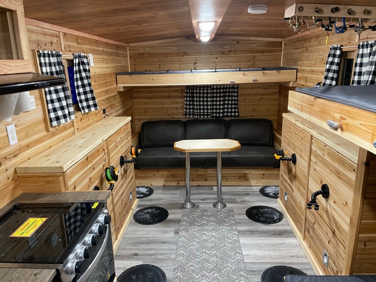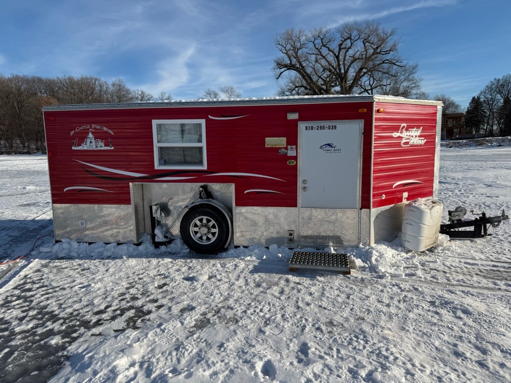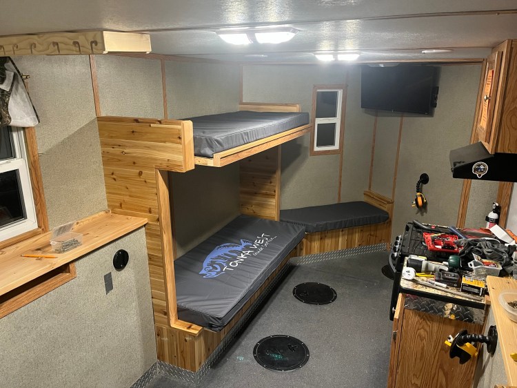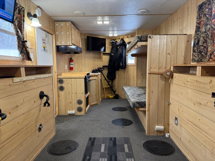 - 8X16 Tonka West Custom has 9 holes and can comfortably fish 6 people and has 4 individual bunks.